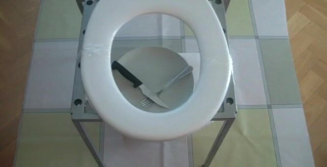 Watch this hairy chick pee and scat on a glass and a plate