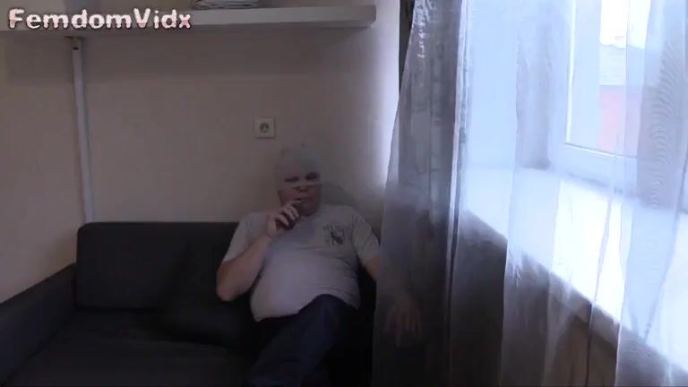 Bound slut squatting & stuffing panties with her scaty ass